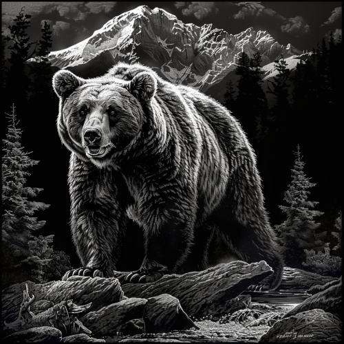 grizzly bear black and white realism high contrast dark detailed with mountain background