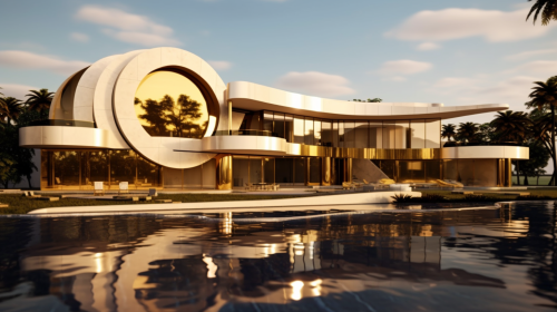 a dark white house with pool and other amenities, in the style of made of glass, 32k uhd, bold and vibrant, light gold and gold, orderly arrangements, ferrania p30, futurist claims --ar 16:9 --v 5.1