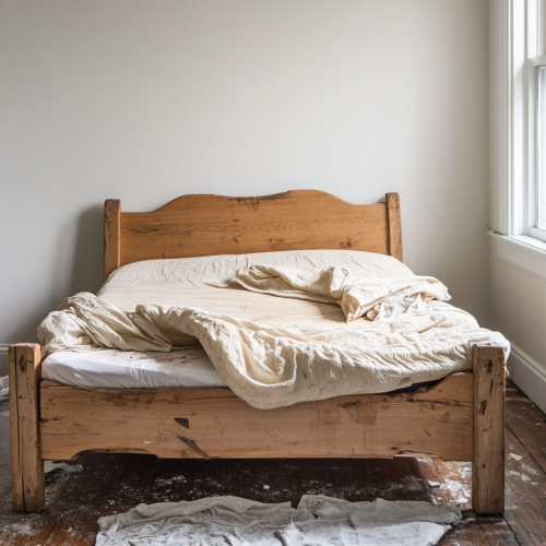 A wooden bed frame with one of the legs snapped in half, causing the mattress to tilt at an awkward angle. The bed linens are disheveled, and the room appears otherwise clean and organized.