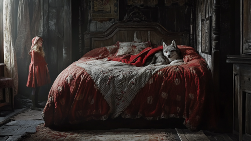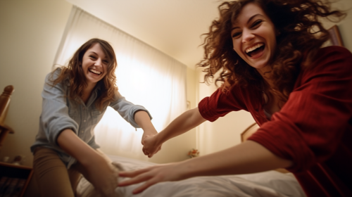 woman holds hands with another woman, dragging her out of bed, white bedroom, past camera, 45 degree angle, smiling, happy, playful, messy --ar 16:9