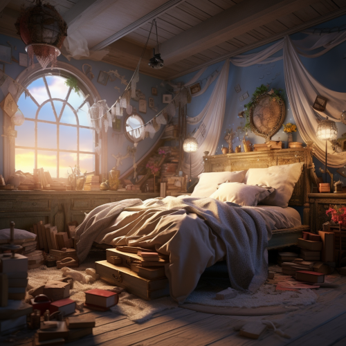 a larged bedroom with a messy bed accented in soft colors of the dawn, make it fantasy-based, add mechanical decor