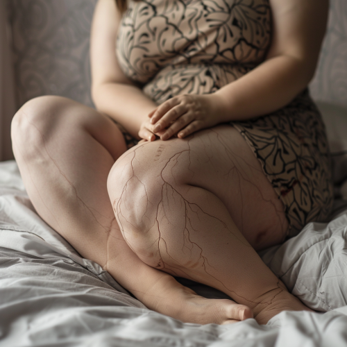 /Fat woman sitting on bed highlighting legs with spider veins, high varicose veins real image, 3#