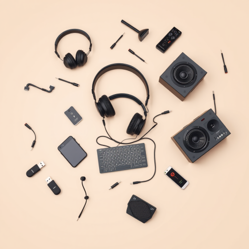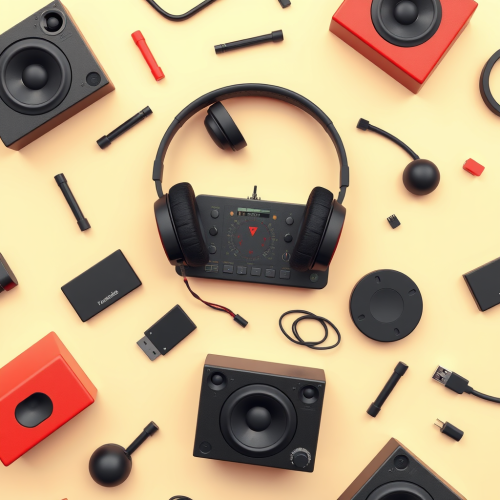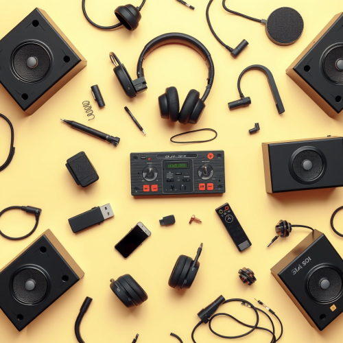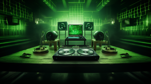 Create a DJ mixing desk and turntables with levitation speakers, super-realistic photography, realistic, the striking feature in this room is a luminous, green light --ar 16:9