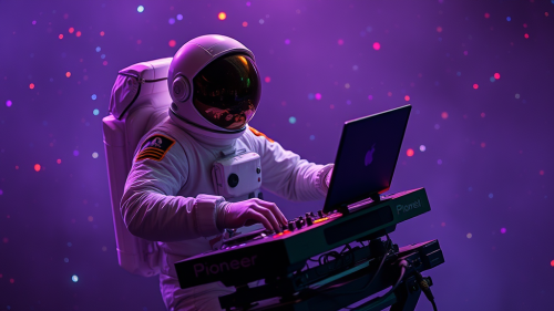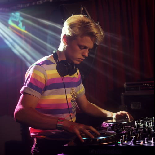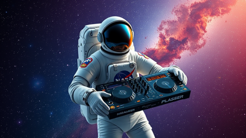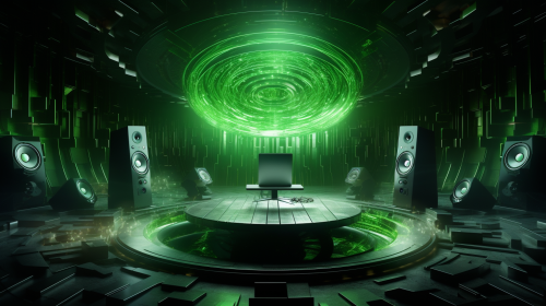 Create a DJ mixing desk and turntables with levitation speakers, super-realistic photography, the striking feature in this moody round club is a luminous, green light --ar 16:9