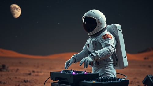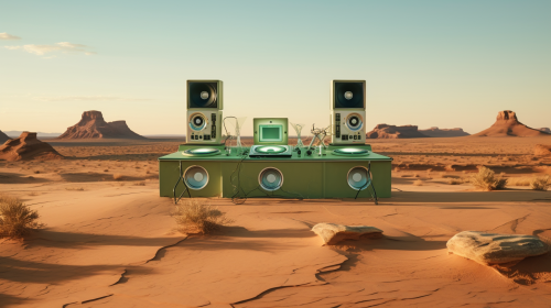Create a DJ mixing desk and turntables with levitation speakers, super-realistic photography, the striking feature in this footy desert landscape is a luminous, green light --ar 16:9