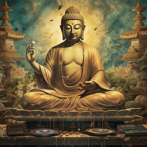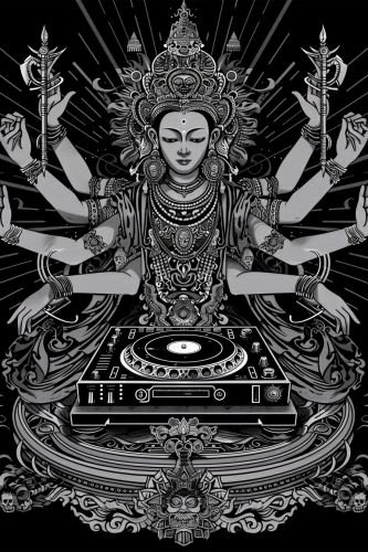 portrait of Avalokiteshvara Goddess, as a DJ, playing in a 4-channel dj controller system setup, with many arms, each hand of the arm is holding a vinyl disc, engraving style, detailed illustration , simmetric design, highly detailed mandala background with musice related elements, dark gothic style, muted tones, reimagined religious art, fantastic grotesque --ar 2:3 --stylize 50 --v 6.0