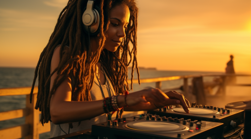 Create a DJ mixing desk and turntables with levitation speakers, organic sound waves in the air, super-realistic photography, the striking feature in this room is a luminous, green futuristic light --ar 16:9