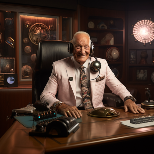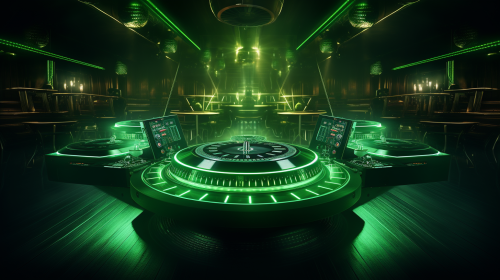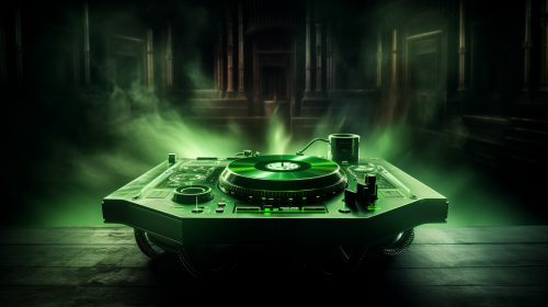 Create a DJ mixing desk and turntables with levitation speakers, super-realistic photography, the striking feature in this atmospheric round club is a luminous, green light --ar 16:9