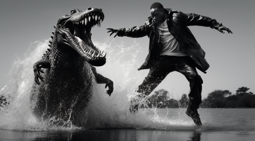 hiphop rapper dj mix beats up gator with a kick shot photo by david, in the style of misha gordin, , african influence, annie leibovitz, webcam photography, pegi nicol macleod, junglepunk --ar 128:71