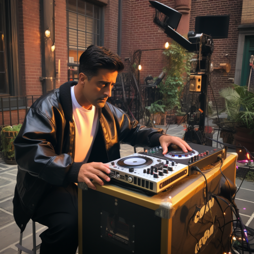 Joey Tribbani from the tv show friends mixing music as a DJ outside in front of the Friends apartment building in NYC
