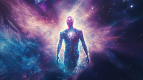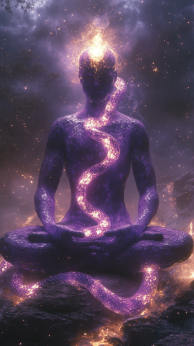 A full-body shot of a translucent, glowing purple humanoid figure, with high contrast. sits in a deep meditative posture, surrounded by an aura of radiant light that symbolizes enlightenment. A vibrant, glowing snake is intricately coiled around the figure’s body, starting at the base of the spine and spiraling upward, winding around the torso, neck, and finally resting its head near the crown of the figure. The snake glows with golden energy, its scales reflecting an ethereal, shimmering brilliance, symbolizing the awakening of kundalini energy. The snake's head is positioned at the crown of the figure's head, representing the culmination of spiritual energy reaching enlightenment. The figure’s body emits a soft but intense radiant glow, with beams of bright light radiating from its chest and third eye, signifying deep spiritual awakening. The surrounding atmosphere is cosmic, with swirling galaxies, stars, and nebulae creating a backdrop of the infinite universe. Soft waves of energy ripple outward from the figure, symbolizing the merging of physical and spiritual realms. Around the figure, energy flows in patterns reminiscent of sacred geometry, adding a mystical and powerful presence to the scene. The overall atmosphere is serene, yet charged with energy, representing spiritual transformation, balance, and the full ascension of kundalini energy through the chakras. --ar 9:16 --s 750