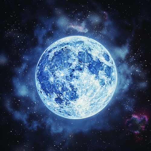 huge illuminated full moon with an anatomical shaped heart shadow on it, background of cosmic dust and galaxies, psychedelic, low contrast, dreamy, optical illusion --v 6.0