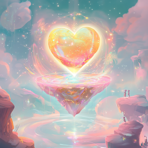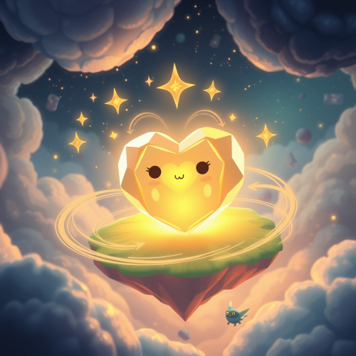 Create a whimsical and mystical style, blending futuristic elements with a sense of playful wonder and cuteness. The visuals should feel like they’re pulled from a dream, with glowing colors and soft gradients. Characters are adorably designed, with exaggerated expressions and charming details. The environments are ethereal, blending fantasy and cosmic elements--filled with floating islands, stars, and glowing creatures. Use smooth, flowing lines and soft lighting, with radiant, magical glows around objects. The aesthetic is a mix of cosmic fantasy and sci-fi, with a delicate balance of light and shadow. Everything feels lighthearted yet epic, like a magical universe where innocence and adventure coexist. The Heart of Truth is a glowing gem-like object that floats in the center of the storm. Its shape is not rigid, but more organic, resembling a multi-faceted crystal with soft, rounded edges. It radiates a warm, golden light that pulses gently, like a heartbeat. The Heart is surrounded by swirling, glowing particles that look like tiny stars orbiting it. The surface of the Heart shimmers with a holographic sheen, shifting between gold, pink, and soft blue hues as it rotates. Its light is soft but strong, illuminating everything around it. The design is both mystical and cute, with a gentle glow that invites the viewer in, making it seem like a precious, living entity.