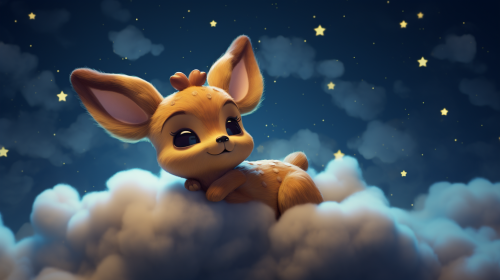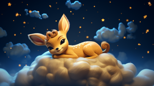 A cute cartoon baby deer sleeping on clouds, with a starry sky background, in the style of Pixar, in the style of Disney, high definition. --ar 16:9 --v 5.2