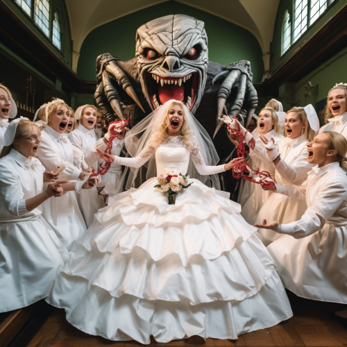 a full body shot of a blonde bride with a surprised face getting married in a huge white wedding dress full of bows, flounces, grills and lace gloves, with laughing bridesmaids