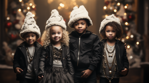 Eccentric and quirky children playing dress up with adult Christmas outfits. Festive stage backdrop. They are meticulously posed and positioned in a minimalist symmetrical setting. Black and white with vibrant color splash. Vibrant hues. Tapestry of whimsy. nostalgia with a dash of quirky charm. Shot with a Pentax. K - 3 III Monochrome. Santa hats. Christmas tree in background. Presented in Bauhaus art style. Extreme close - up camera angle. Very close. Low angle camera shot. Looking straight up, Blurred background. Bakeh elements. High - end. Very Stylish. Black and white photograph. --ar 16:9 --q 0.5 --s 750