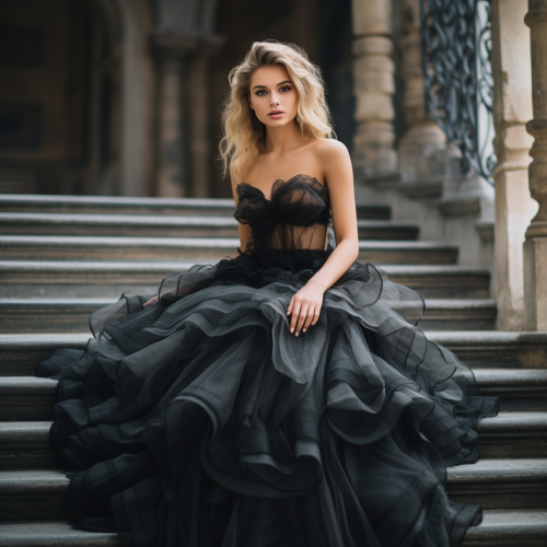 Elegant Black Dress with Open Bodice and Tulle: A Blonde Bride on Castle Stairs
