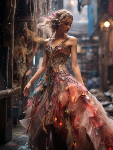 faerietale couture crystal dress, dramatic, cute, fairy companion, dense urban setting, brutalist urban background, fairy dust, splashes of radiant color