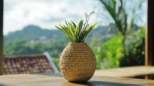 braided corn straw vase, with plants inside, this vase is on top of a wooden table and in the background the scenery of a house in Brazil, minimalist but symbolic setting, product vibe photo still --ar 16:9