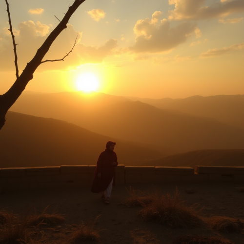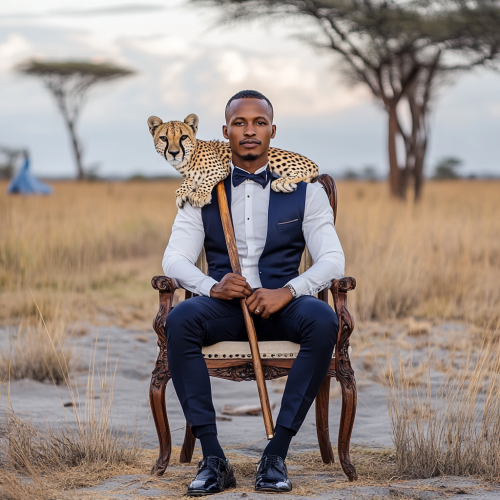 wedding groom in Botswana, groom is holding a wooden staff, photo shoot, he is sitting on a wooden royal chair, wearing a cowhide hide on his shoulders, wearing navy trousers and black shoes with white shirts that have a navy trim down the front and on cuffs, very neat and handsome, modern, the image should be relevant to location, almost sunset , regal shot