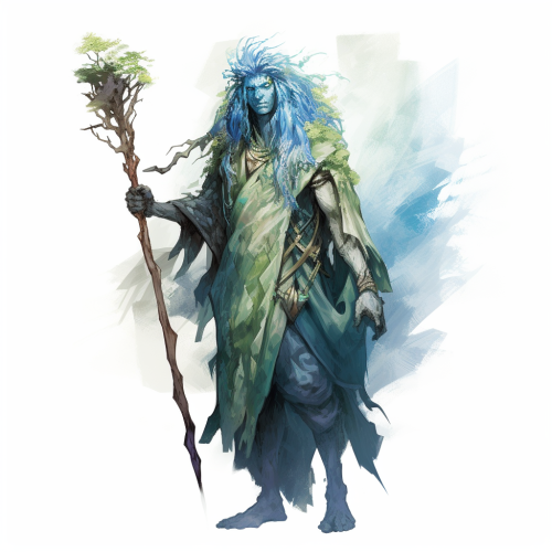 full body portrait, drawing of a druid holding a wooden staff with inserted gem emanating light, in the style of Bloodborne, using tones of blue and green, on a white background