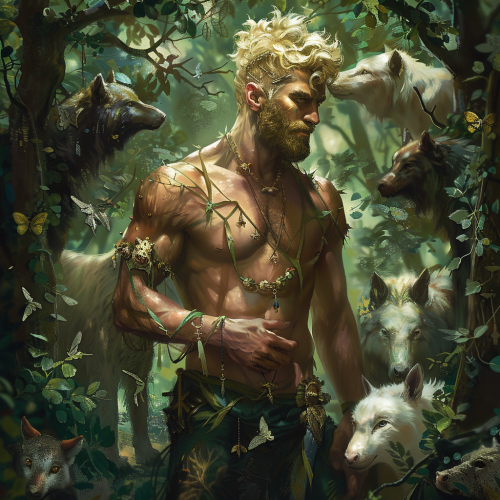 fantasy art of adult male druid in the forest, short gold spiky hair and beard, big and strong body, green and white colors, surrounded by animals and trees, hd, detailed, dark fantasy style, realistic