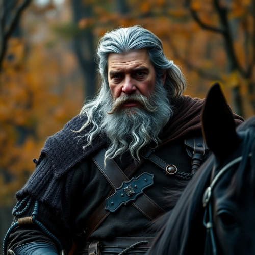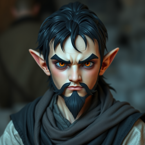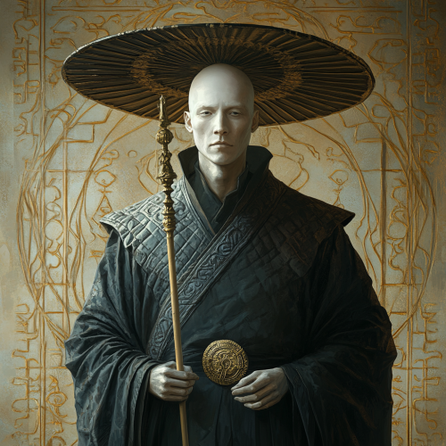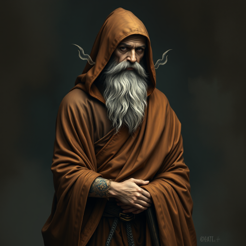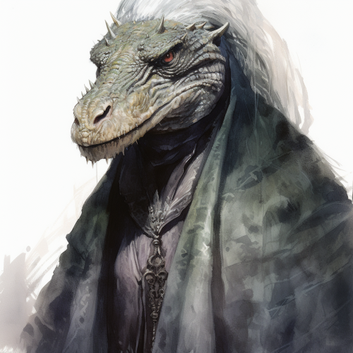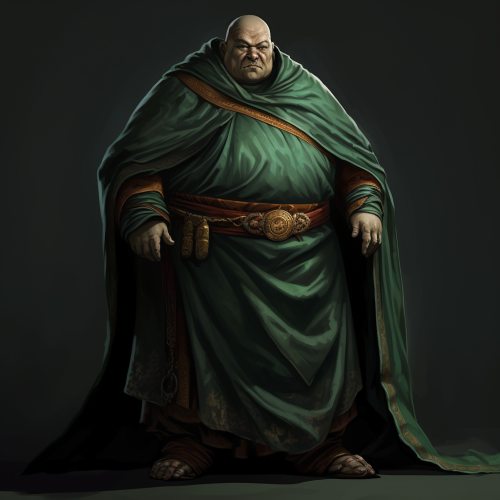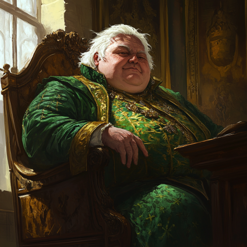 obese human male, white haired mullet with a strong widows peak on the top of his head, the right side of his face and right eye obscured by scars from a burn, wearing emerald green robes with gold filigree, sitting at a wooden desk in a high-backed chair, with a friendly smile on his face. The atmosphere should be regal, in the style of Tony DiTerlizzi