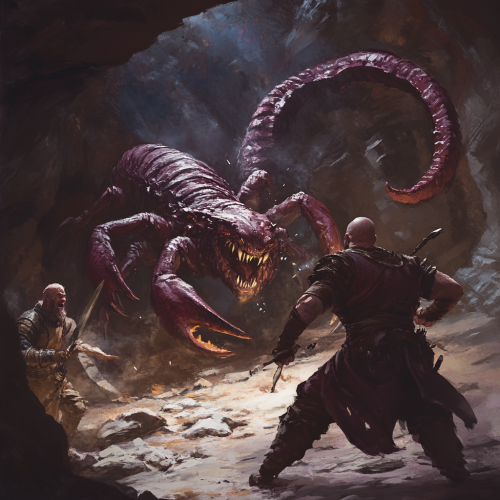 a group oftwo adventurers is battling a giant scorpion in a dark cave. One of the adventurers holds a torch in the background which is the only source of light. A human monk who is bald and wears maroon robes, battles the scorpion in front with a shortsword and fists. A male dwarf with brown hair and beard in armor wields a war hammer. --chaos 20