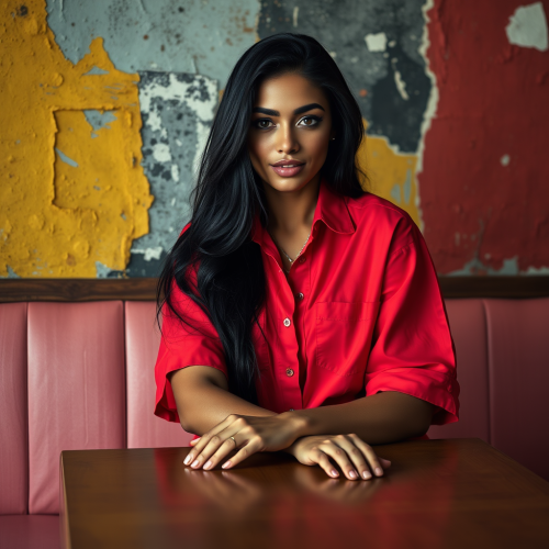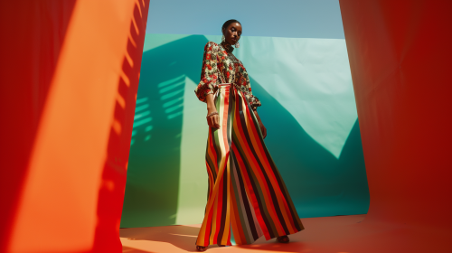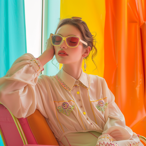 an advetisment photography with a fashion model with slim sunglasses wearing a soft plush pastel color tunic top with minimal pastel color embroidery, sitting on an office chair with poppy color walls and a window with rain in the background, warm to cool studio lighting --v 6.0