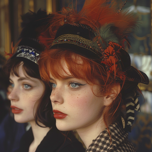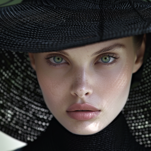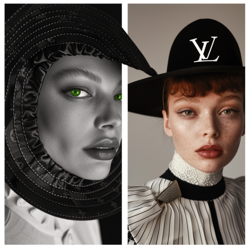 A high-fashion editorial image featuring a model in two distinct poses. On the left, a close-up of the model's face is framed by a large, avant-garde black hat with an open circular design that accentuates her sharp features and intense green eyes. Her makeup is minimal, with soft, natural tones that emphasize her flawless skin and high cheekbones. On the right, the same model is shown in a full-body shot, wearing a sophisticated, modern outfit. The ensemble consists of a white, asymmetrical top with subtle pinstripes, paired with a high-waisted black and white skirt that features a bold Louis Vuitton logo clutch. She completes the look with white tights and pointed heels. The model's pose is elegant and poised, exuding confidence and grace. The background is a clean, neutral grey, highlighting the fashion and the model's strong presence. The overall aesthetic should be reminiscent of Peter Lindbergh's iconic style, focusing on the natural beauty of the model, the simplicity of the composition, and the timeless elegance of the fashion. --v 6.0