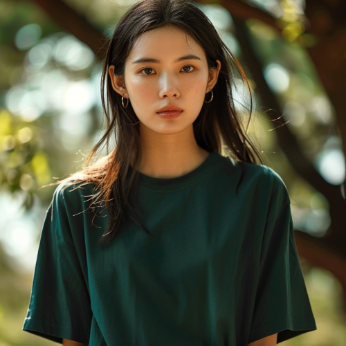 a beautiful woman model,basic oversize forest green t-shirt, basic no print or logo on it,midium shot, 8K,hyper quality Park Chan Wook --v 6.0 --ar 1:1