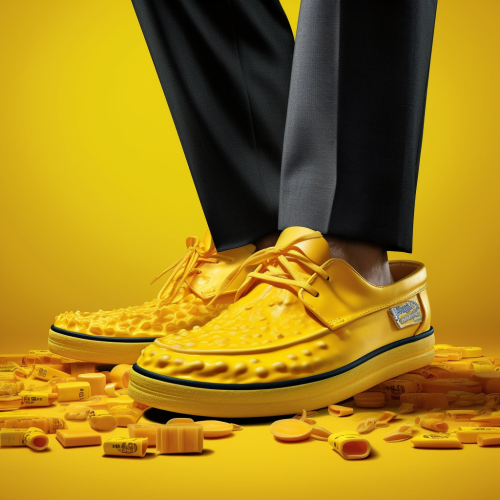 a magazine print advertising with a snif in part that are for a fashion brand based on velveeta cheese and yellow crocs shoes, portrait realistic like a fashion campaign --v 6.0 --ar 9:16 --s 750