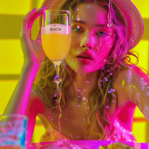 AWARD WINNING image by gucci photographer of beautiful instagram model at brunch spilling champagne with neon yellow background and hits of pink , magic realism, 8k, sharp, v 5.2