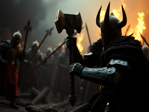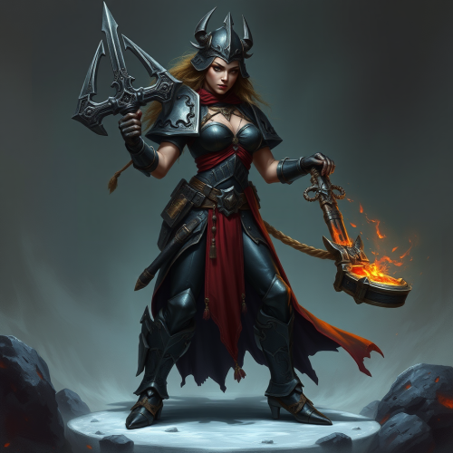 older dwarf woman, cleric, body similar to Lord of the rings Dwarf, in the style of oil painting, cleric of freya lady of fire and goddess of war, shield maiden, green eyes, blond hair braided into a viking style, wielding a warhammer, healer