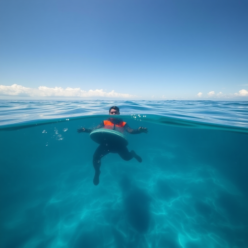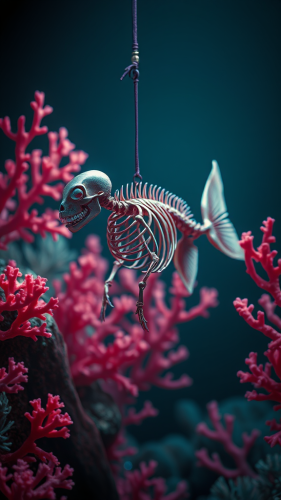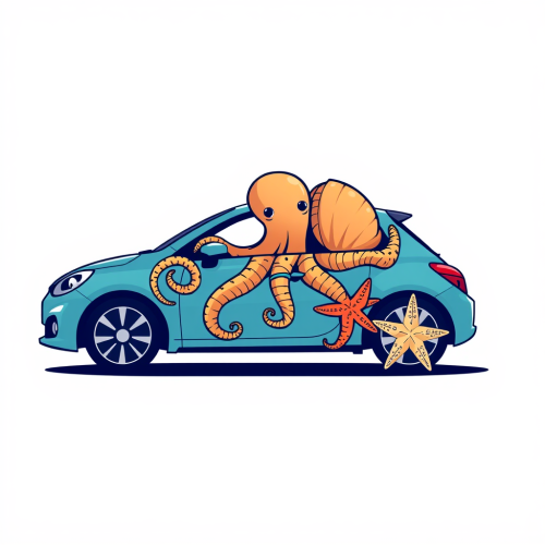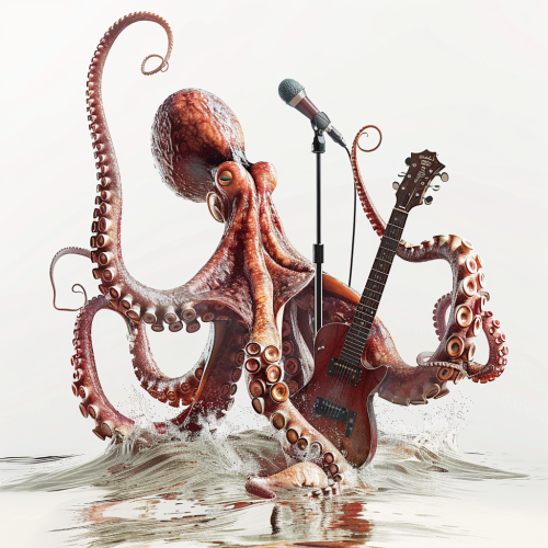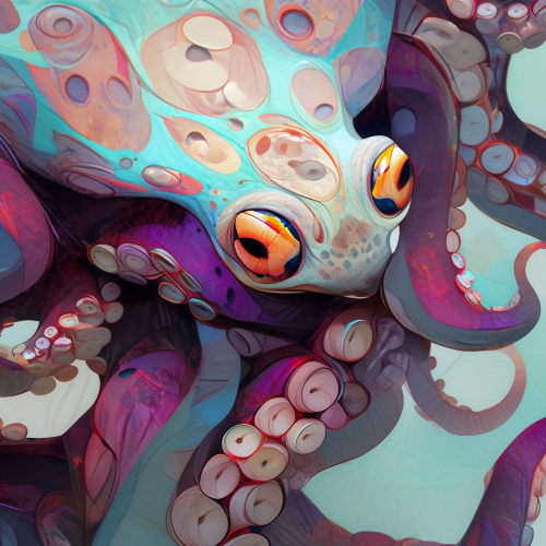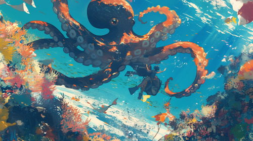 an 8-armed octopus swims in the waters off of Miami Beach, he is next to a brightly colored coral reef, high-definition, anime-style, --ar 16:9 --niji 6