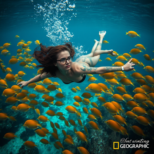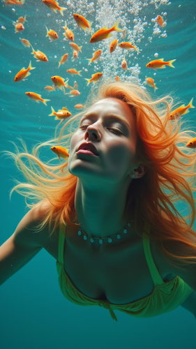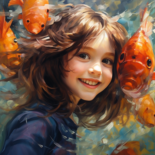 girl's face close-up, emotions, fish, octopus, water, detail, Andy's style, smile. oil painting