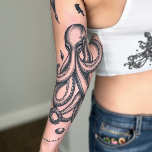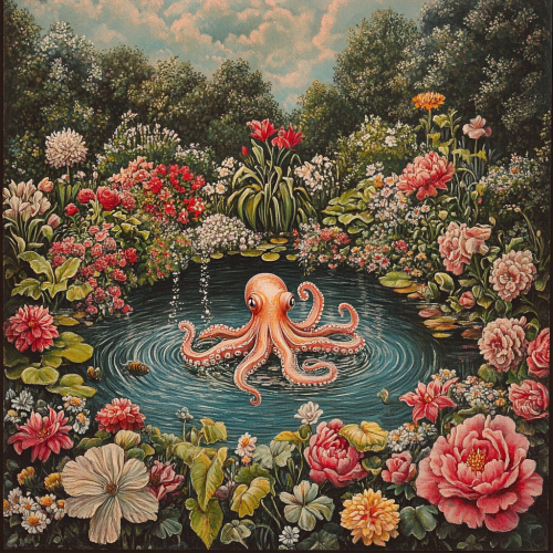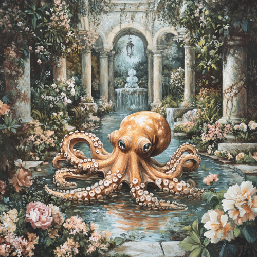 an illustration of an octopus suberged in a pond inside a beautiful garden, tenticles poke out above the water to mingle with the flowers above, painted in the style of classical rococo, traditional oil painting, pastel colors