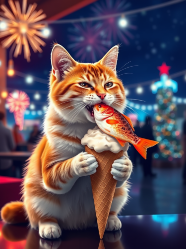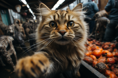 Selfie of a cat with a fish in its mouth running on two legs from sellers at the market --ar 3:2 --s 750 --v 5.2
