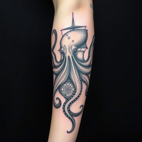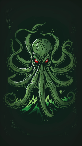 a fantasy flag displaying a green octopus with red eyes, a green sea at the bottom, and a black background. Fantasy, graphic art, banner, nationalism --ar 9:16