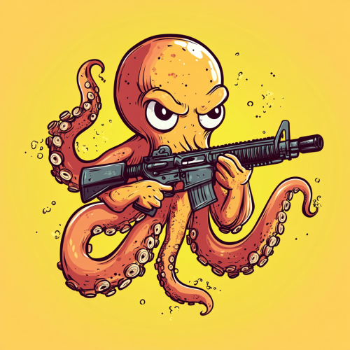 vector apple style cartoon emoji. An octopus holding a pistol with one tentacle and an AR-15 with another. Octopus is shooting out ink as a distraction.