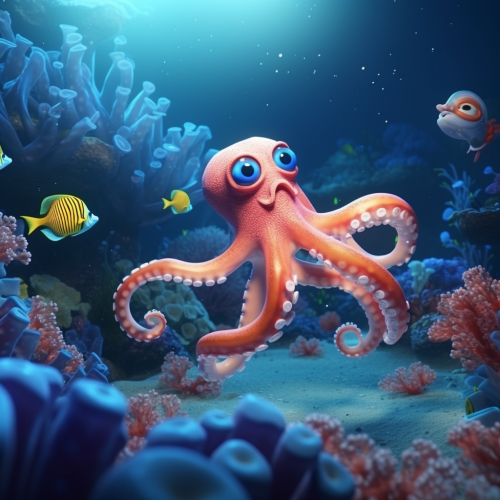 3d animation, a beautiful cartoon underwater, octopus, blue scene with fishes in center, in the style of three --v 5.2