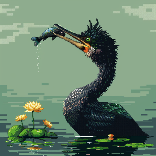 8 bit pixel art Cormorant Pixel Art Concept: Cormorant fishing is a traditional method that can be linked to Hakka areas. Using pixel art to depict a cormorant can blend the traditional fishing technique with the digital age, symbolizing the gathering of resources and knowledge. Visuals: A pixelated cormorant, possibly with a fish in its mouth, to represent prosperity and success in digital ventures. --v 6.0