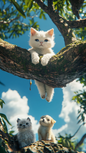 A highly detailed and cinematic scene captured in 8K resolution. Under a bright, clear blue sky, a humorous and slightly dramatic moment unfolds as Palsoon, a 24-year-old woman, is found draped awkwardly over a thick tree branch. Below her, a small white Persian kitten named Komuri and a fluffy 30-day-old Pomeranian puppy named Bomuri are looking up at her with concerned yet determined expressions. Palsoon, still unconscious, hangs in a slightly comical position, her limbs loosely draped over the branch. The tree is tall with sturdy branches, surrounded by lush greenery, while the sky is a vivid blue with a few soft clouds. The scene captures the contrast between the serene natural setting and the unusual predicament. The lighting is warm and natural, highlighting the details of Palsoon’s clothing, the soft fur of the animals, and the vibrant colors of the tropical environment. The atmosphere is both lighthearted and filled with a sense of rescue. Parameters: Camera: IMAX laser camera Style: Hyper-realistic, cinematic, bright and natural lighting, 8K detail, lighthearted and adventurous atmosphere --ar 9:16