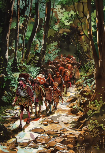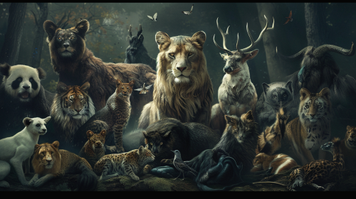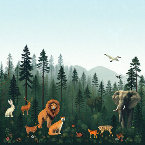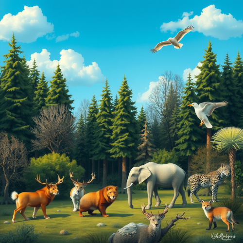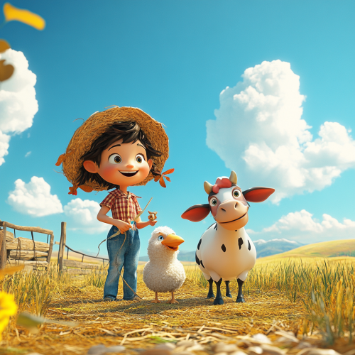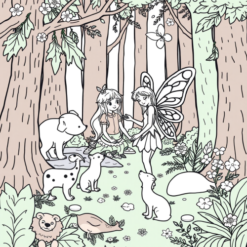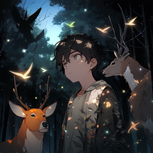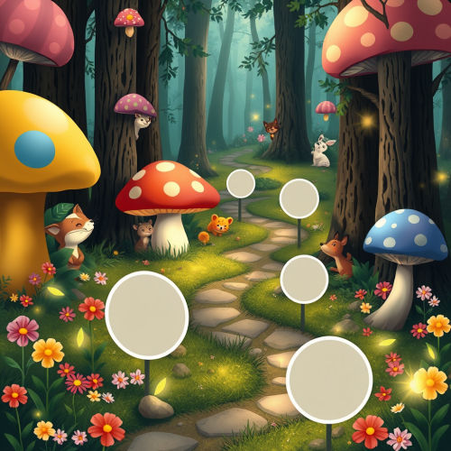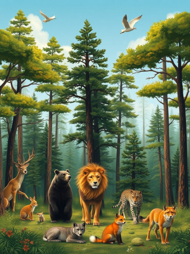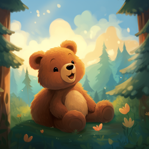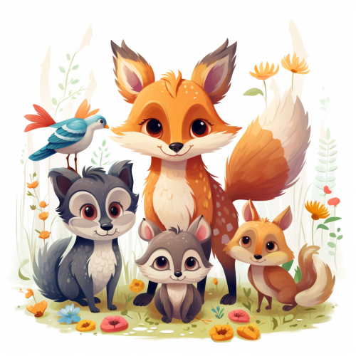 A collection of friendly forest animals. This includes a bluebird with a melodious expression, a graceful deer with glowing antlers, a curious raccoon with a striped tail, and a playful fox with a swishy tail. Each animal exudes warmth and curiosity, ready to join the adventure. Append: in children's storybook style. Bright colors. Illustrated. --seed 367327247