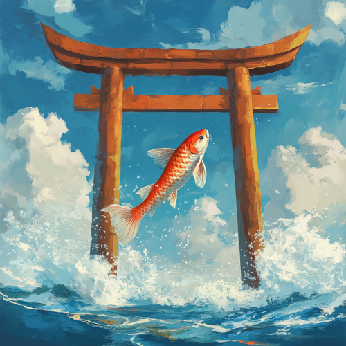 A small carp jumps over the dragon gate. You can see a sky with clear blue clouds and calm waves on the bottom, and the carp is looking straight ahead.