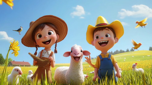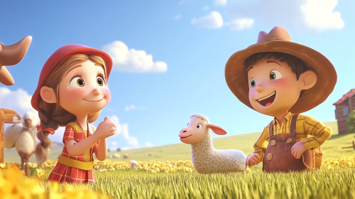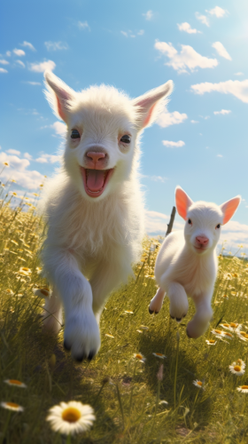A realistic photo of a lamb and a baby goat running in a meadow on a beautiful sunny day, 4k, --ar 9:16 --v 5.2