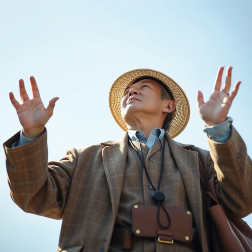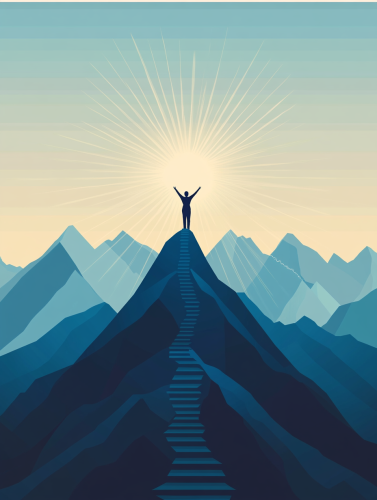 A vivid and dynamic illustration symbolizing the concept of achieving goals. A person standing on top of a mountain peak, arms raised triumphantly, with a clear blue sky and sunlight shining down, representing success and accomplishment. In the background, a series of progressively smaller mountains or steps leading up to the highest peak, symbolizing the journey and challenges overcome. Include elements like a distant flag planted at the summit, and abstract lines or arrows pointing upwards to emphasize direction and ambition. --ar 3:4 --v 6.1