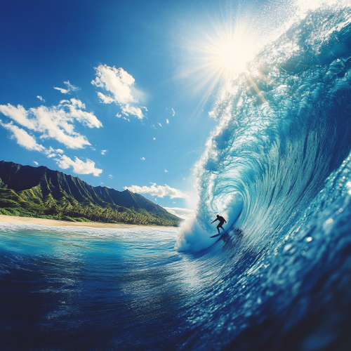 An action-packed, ultra-realistic photo of a surfer catching a massive wave at a famous Hawaiian beach, the vibrant blue ocean sparkling under the bright sun, with the iconic coastline of Hawaii in the background. The wave is towering, curling perfectly over the surfer who is expertly navigating the board. The sky is clear with a few fluffy clouds. The lush, green Hawaiian mountains can be seen in the distance, with a beautiful tropical vibe. Cinematic composition, 16:9 aspect ratio, photorealistic style.