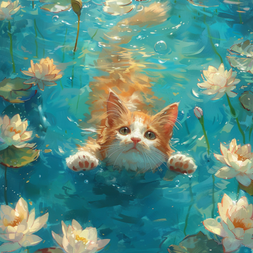 Generate an image of an adorable cat swimming in a shimmering pond, surrounded by blooming water lilies under a clear blue sky --chaos 5