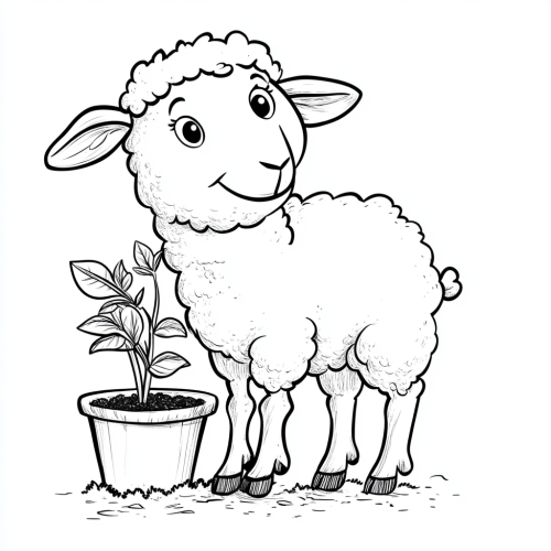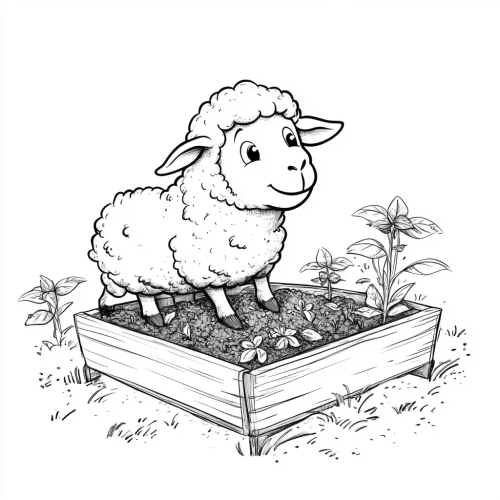 disney cartoon style, happy friendly sheep plant basil in the soil of the bed in the garden, standing outside the bed, standing sideways but looking into the camera, white background and black and white, for coloring